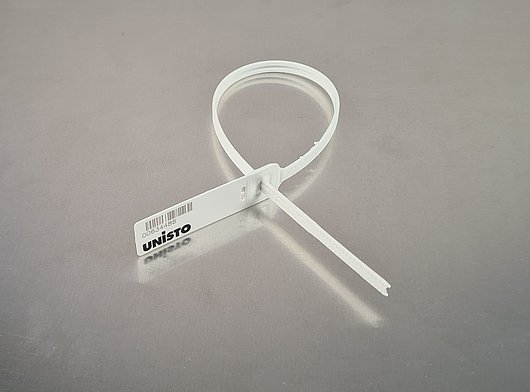 Durchziehplombe mit einem einzigartigen Schliessmechanismus aus Stahl.